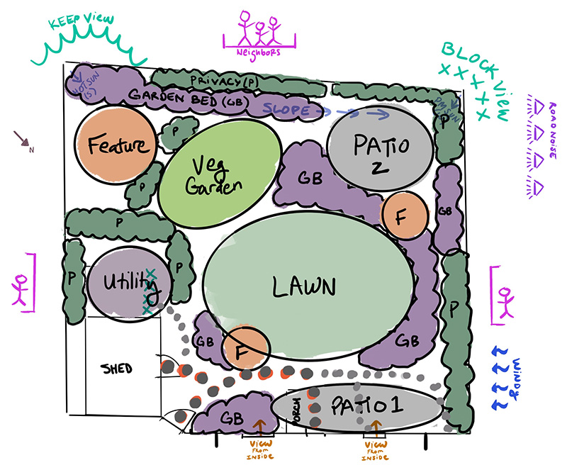 Make an actionable visual diagram to create your dream landscape. I’ll show you how a garden can be divided into rooms with different purposes, just like the inside of your house! Then, how to come up with multiple landscape layout ideas quickly using simple circle and arrow and tools.