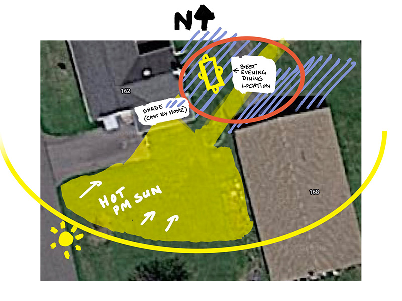 I’ll show you how to consider your proximity to neighbors, road noise, sun levels, utility lines (above & below) to decide where you might find the most peaceful place to sit and enjoy your favorite beverage.